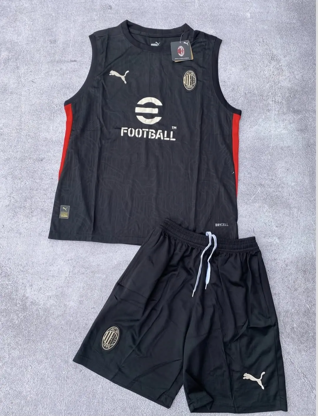 Mostrá la elegancia y el estilo del AC Milan, uno de los clubes más históricos del fútbol europeo. Este conjunto combina musculosa y shorts confeccionados en tela deportiva de alta calidad, ofreciendo comodidad, frescura y un diseño fiel a los colores rojinegros que marcaron época. 🔹 Detalles del producto