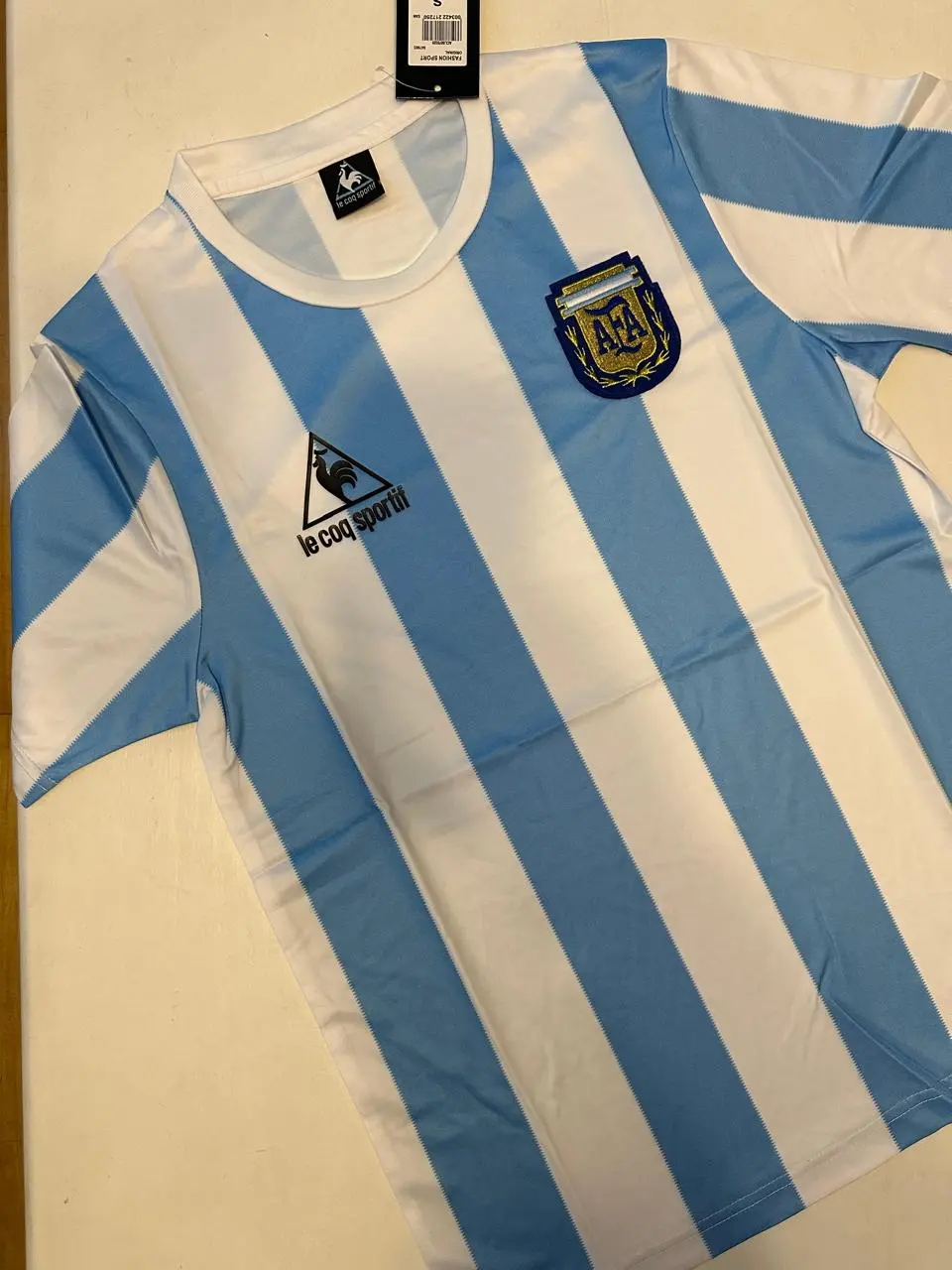 Su diseño con franjas celestes y blancas, cuello redondo blanco y escudo bordado con relieve dorado rinde homenaje al equipo liderado por Diego Armando Maradona, símbolo eterno del fútbol argentino.