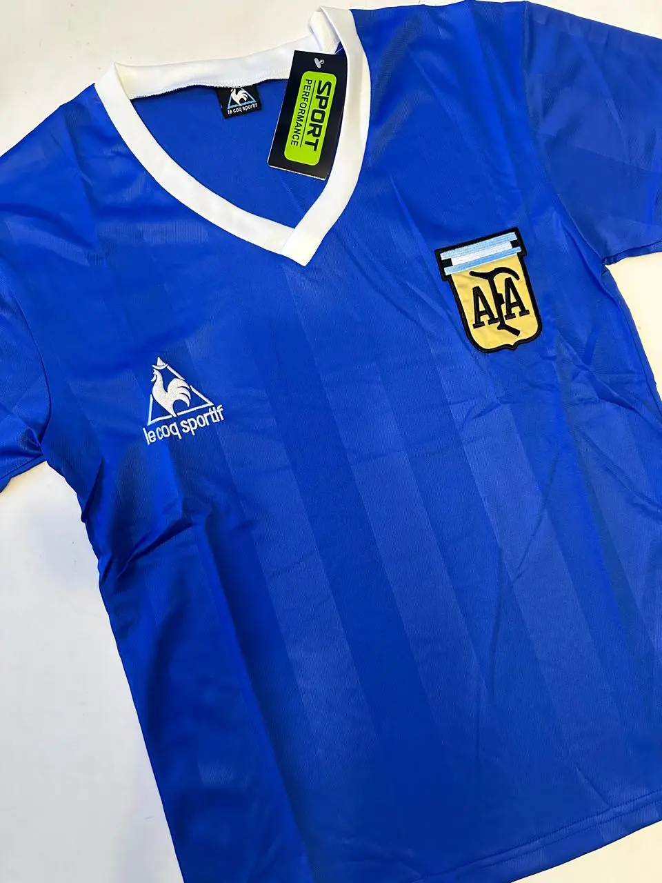 Historia, coraje y leyenda en una sola camiseta. La Selección Argentina Suplente 1986 Retro, confeccionada por Le Coq Sportif, es una réplica fiel del modelo usado por el equipo en el histórico partido frente a Inglaterra. Su color azul profundo, combinado con el cuello blanco en “V” y el escudo AFA bordado, rinde homenaje a uno de los momentos más grandes del fútbol mundial: el gol de Maradona a los ingleses y “la Mano de Dios”.