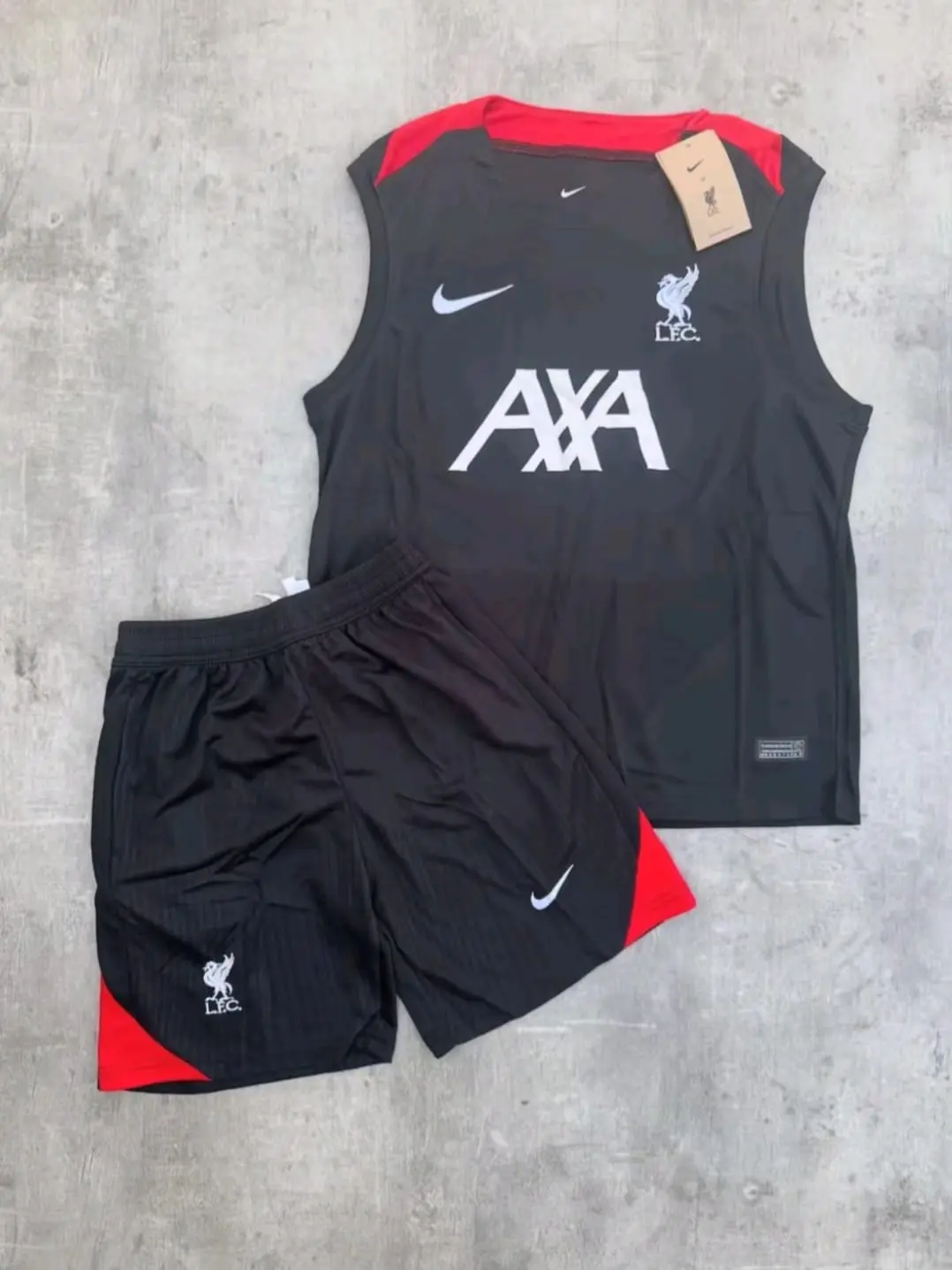 Este conjunto combina musculosa y shorts confeccionados con materiales deportivos de alta calidad, ofreciendo frescura, comodidad y un diseño fiel al espíritu del equipo de Anfield.
