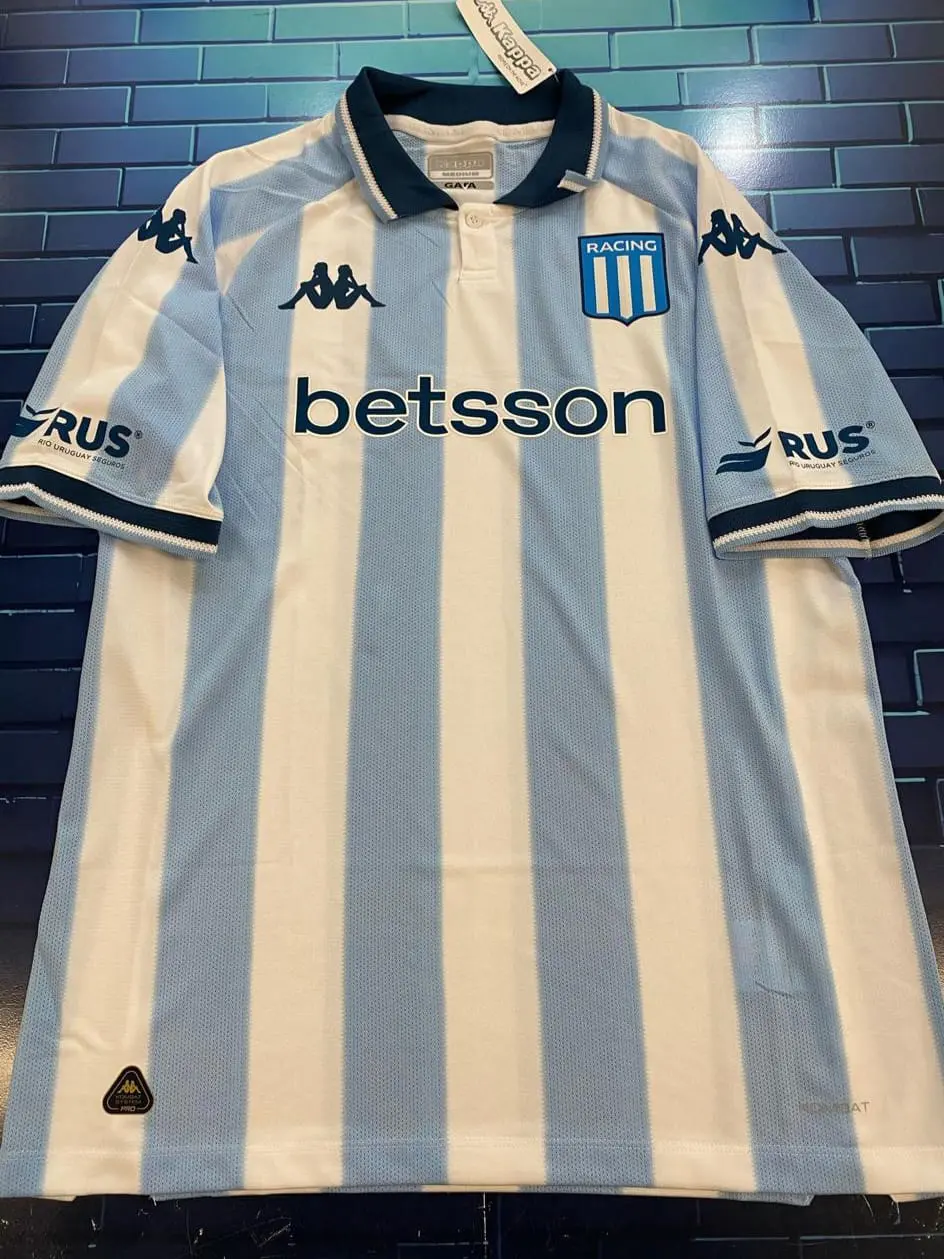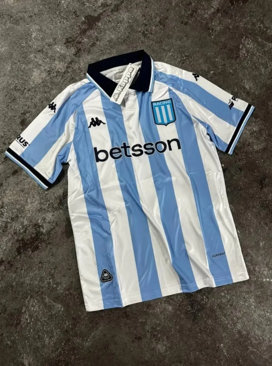 La camiseta titular de Racing Club 2024/25 conserva la mítica identidad albiceleste que representa al equipo de Avellaneda, incorporando detalles modernos como el cuello negro con vivos blancos, escudo bordado y logos en contraste que resaltan la elegancia y jerarquía del club.