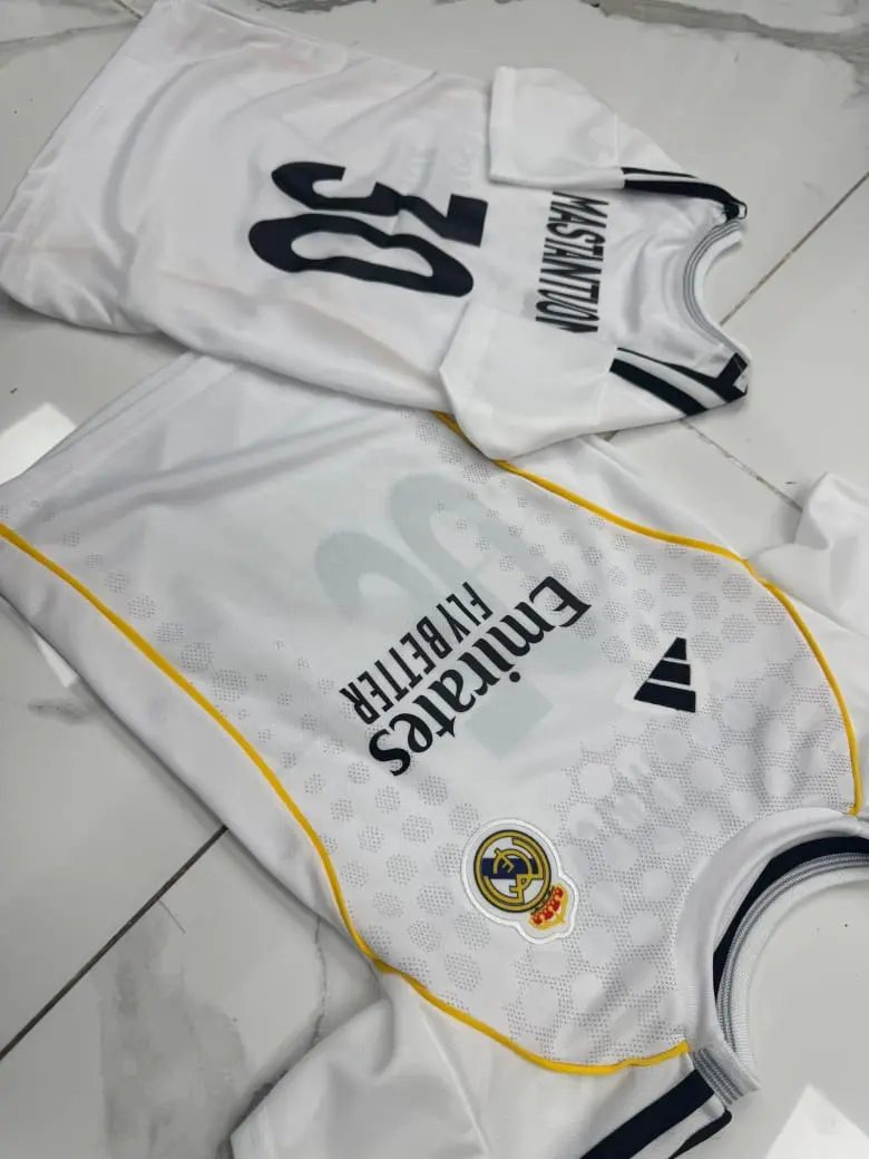 Disponible en talles 6, 8, 10, 12, 14 y 16, para que cada pequeño hincha del Madrid pueda sentirse parte de la élite.