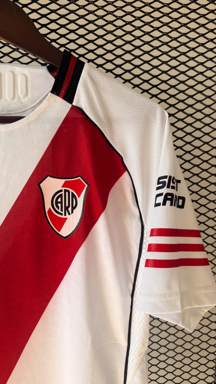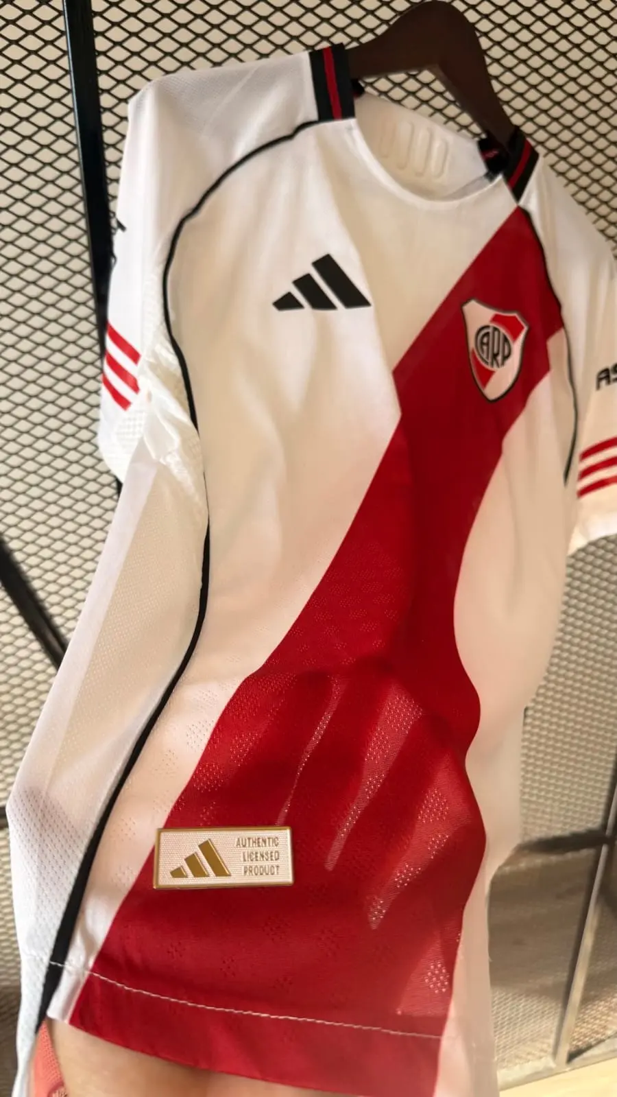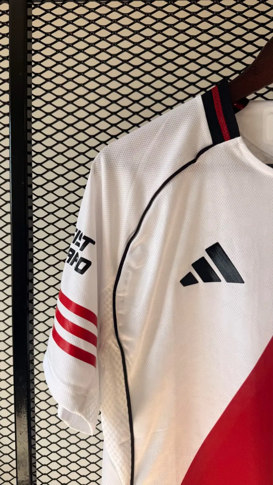 La camiseta titular de River Plate 2025, creada por Adidas, mantiene el emblema eterno de la banda roja sobre fondo blanco, símbolo de grandeza y pasión que trasciende generaciones.