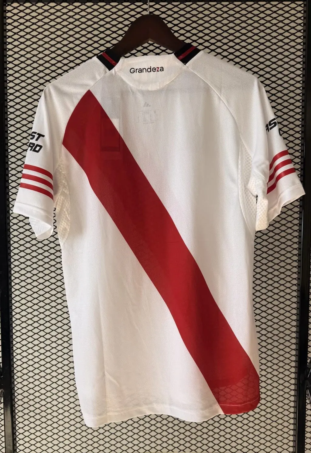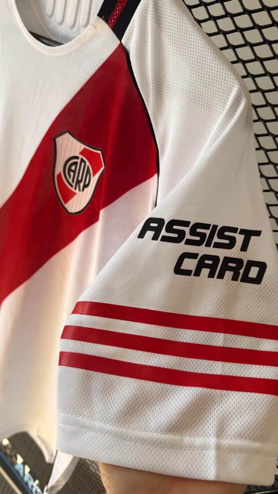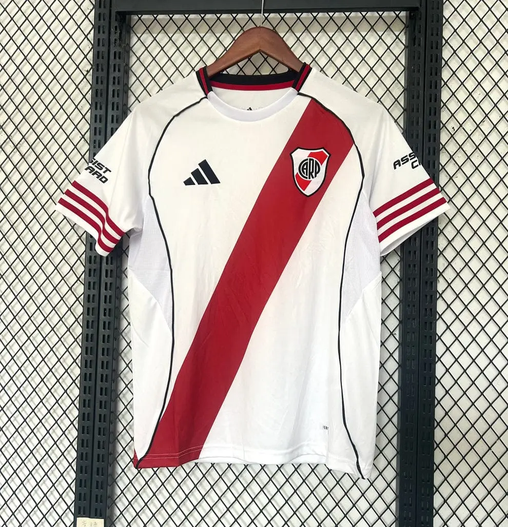 La camiseta titular de River Plate 2025, creada por Adidas, mantiene el emblema eterno de la banda roja sobre fondo blanco, símbolo de grandeza y pasión que trasciende generaciones.