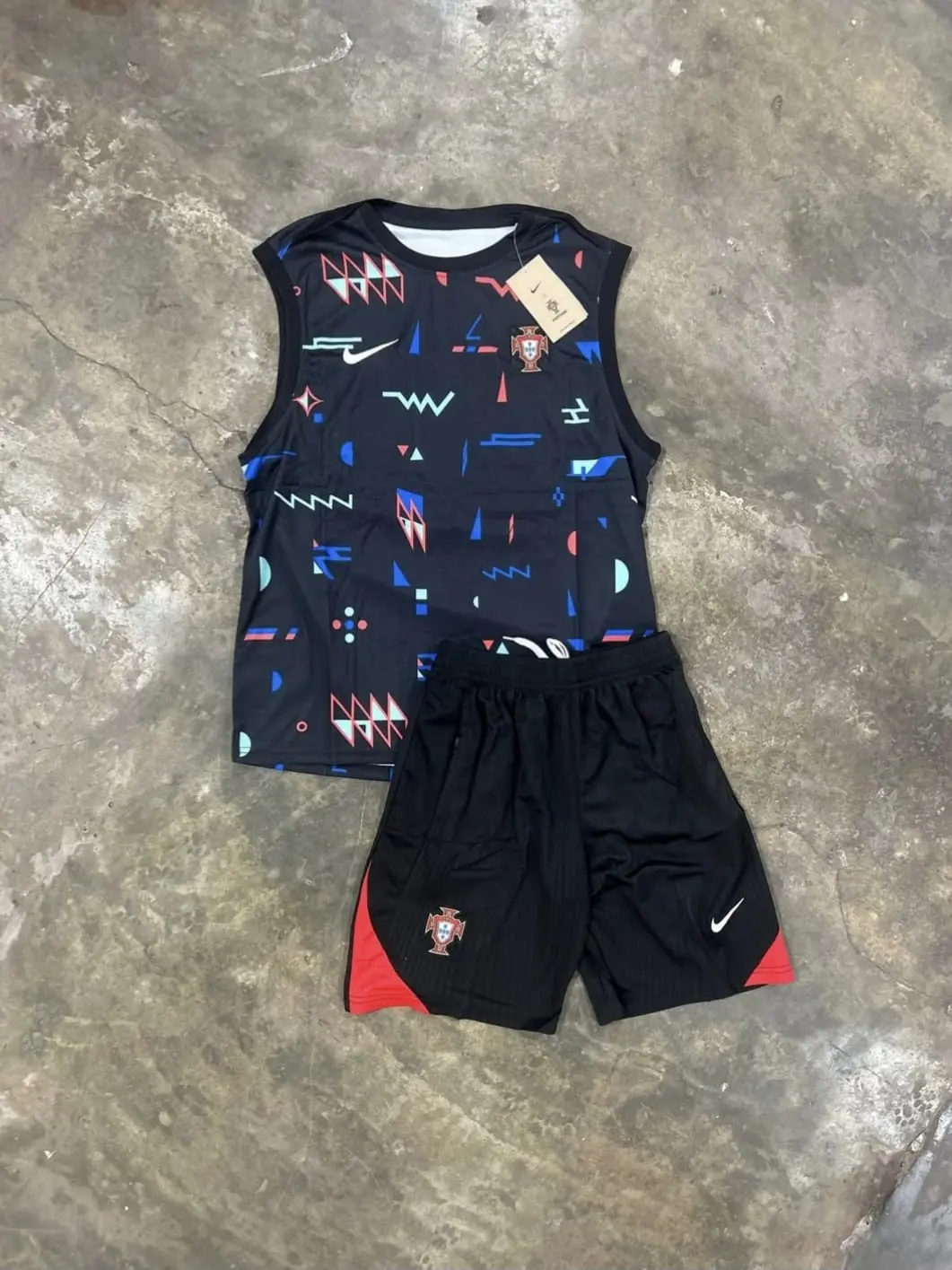 Este conjunto combina musculosa y shorts confeccionados con materiales deportivos de alta calidad, ofreciendo comodidad, frescura y un diseño inspirado en el espíritu competitivo del equipo liderado por Cristiano Ronaldo.